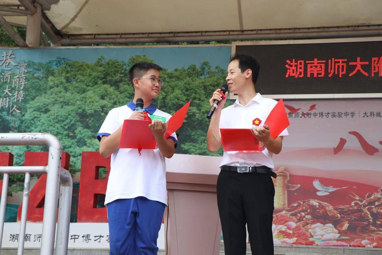 湖南师范大学附属中学副校长、湖南师大附中博才实验中学校长、党委副书记许小平为全校师生上了新学期第一堂课。他有三句话与同学们共勉:心中有国,厚植家国情怀;肩上有责,铸就坚韧品格;手中有炬,点燃创新火种。