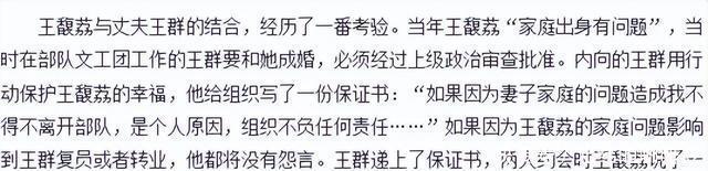 由于王馥荔“家庭出身不好”,部队不允许,若是非要在一起,那么王群可能面临的就是开出军籍的风险。 面对组织的压力,王群毫不犹豫地选择了爱情,他向组织写了一封保证书,承诺一切后果由个人承担。 这份甘愿为爱牺牲一切的当担,在当时震撼了很多人,也最终打动了组织,成全了他们的缘分。