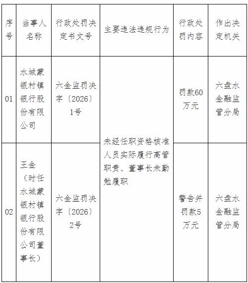 【大河财立方消息】3月31日,国家金融监督管理总局六盘水监管分局披露的行政处罚信息显示,因未经任职资格核准人员实际履行高管职责、董事长未勤勉履职,水城蒙银村镇银行被罚60万元,时任该行董事长王金被警告并罚款5万元。